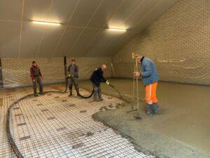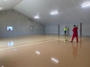 De ruimte is voorzien van een volledig nieuw kozijn met deur en een grote raampartij, mede mogelijk gemaakt door Trienekens uit Boekel. Ook hebben we zelf actief bijgedragen aan de bouw: de vloerverwarming is in eigen beheer aangelegd. De installatie werd geleverd door Giesbers CV Service. Halverwege november heeft Royackers uit Milheeze het beton gestort. Vervolgens heeft Sika uit Deventer — specialist in sportvloerafwerkingen — de hoogwaardige, professionele sportvloer aangebracht.